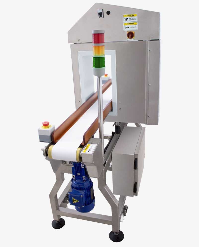 Le détecteur de métaux permet la détection de corps étrangers métalliques à l’intérieur des produits, permettant la suspension du processus de production, au moyen de systèmes d’alarme optiques et acoustiques.